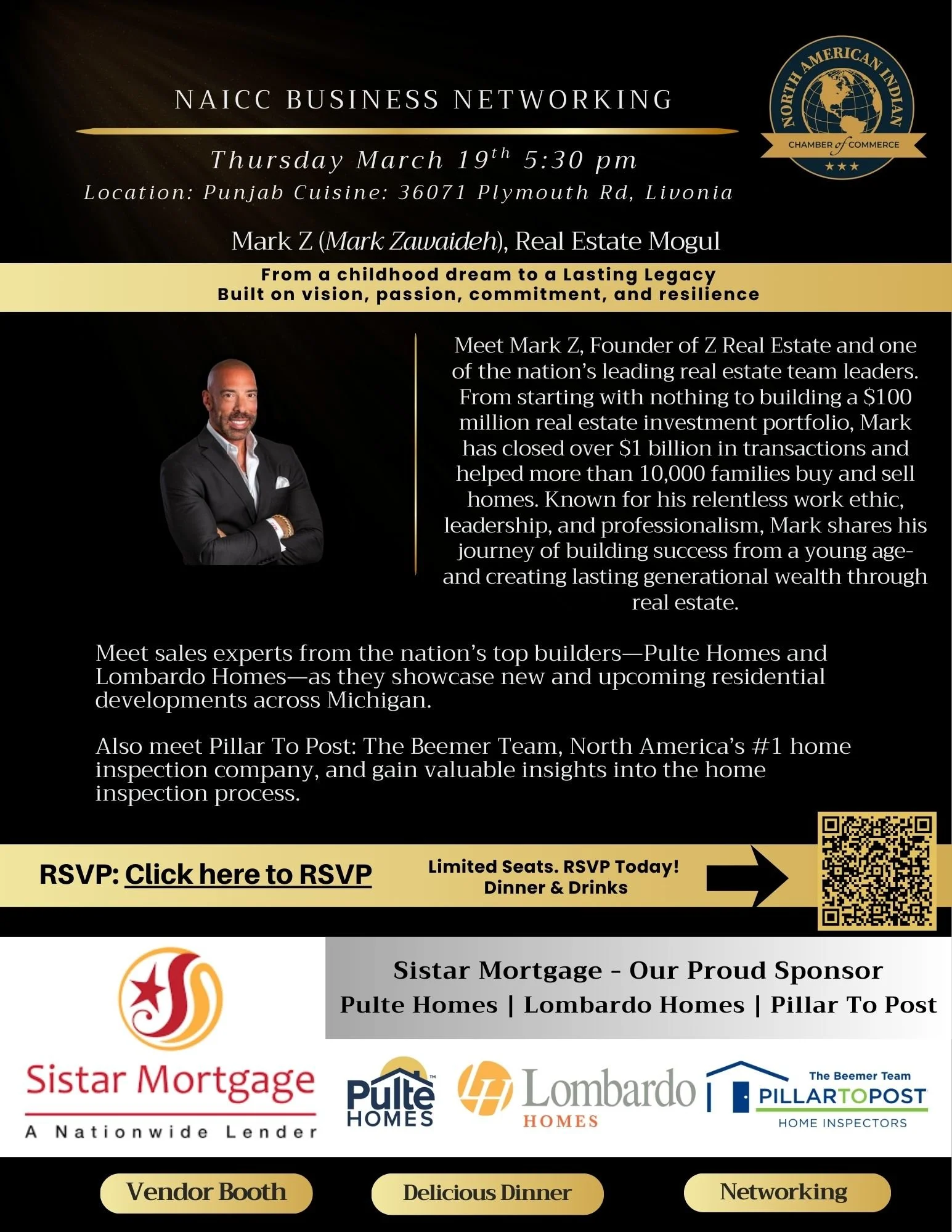 This networking evening will feature distinguished leaders, including Mark Z, Real Estate Mogul; Rajeev Gandhi, President of Sistar Mortgage; Dhaval Vaishnav, President of NAICC; Matthew Beemer, Pillar to Post; a Sales Representative from Pulte Homes; and Hailey Bobinac, Lombardo Homes.
